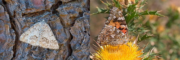 Fig. 3. Pseudoterpna coronillaria (Hübner, 1817), un Eterocero, e Vanessa cardui (Linnaeus, 1758), un Ropalocero.
